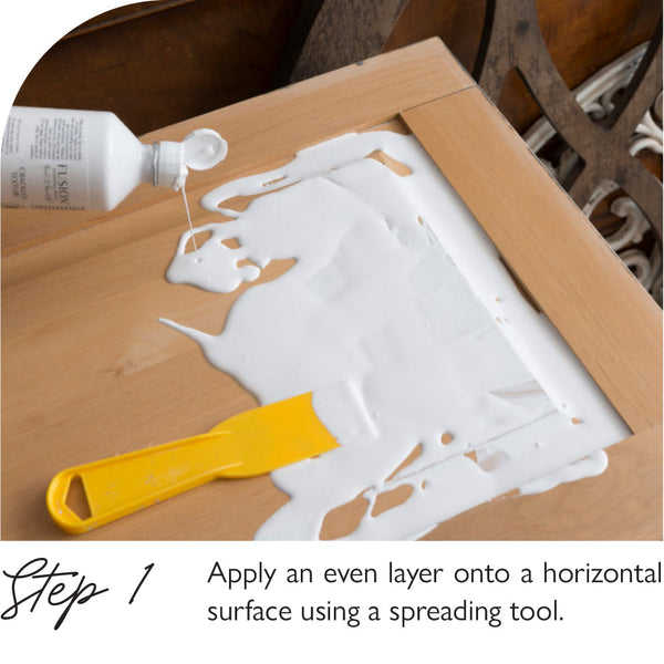 Stir before using. Apply to a horizontal surface for best results. Apply an even layer with a spreading tool. This product is self-levelling. Tap to settle air bubbles. Thicker application will result in larger, more defined cracking. Spreading will result in smaller cracking. DO NOT MIX PAINT with this product or no cracking will occur.